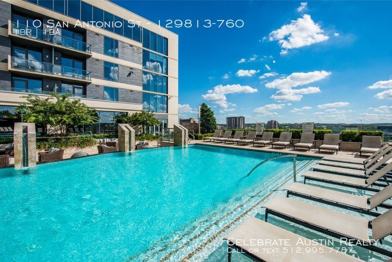 Camden rainey street features a rooftop amenity deck with views of the downtown austin skyline.