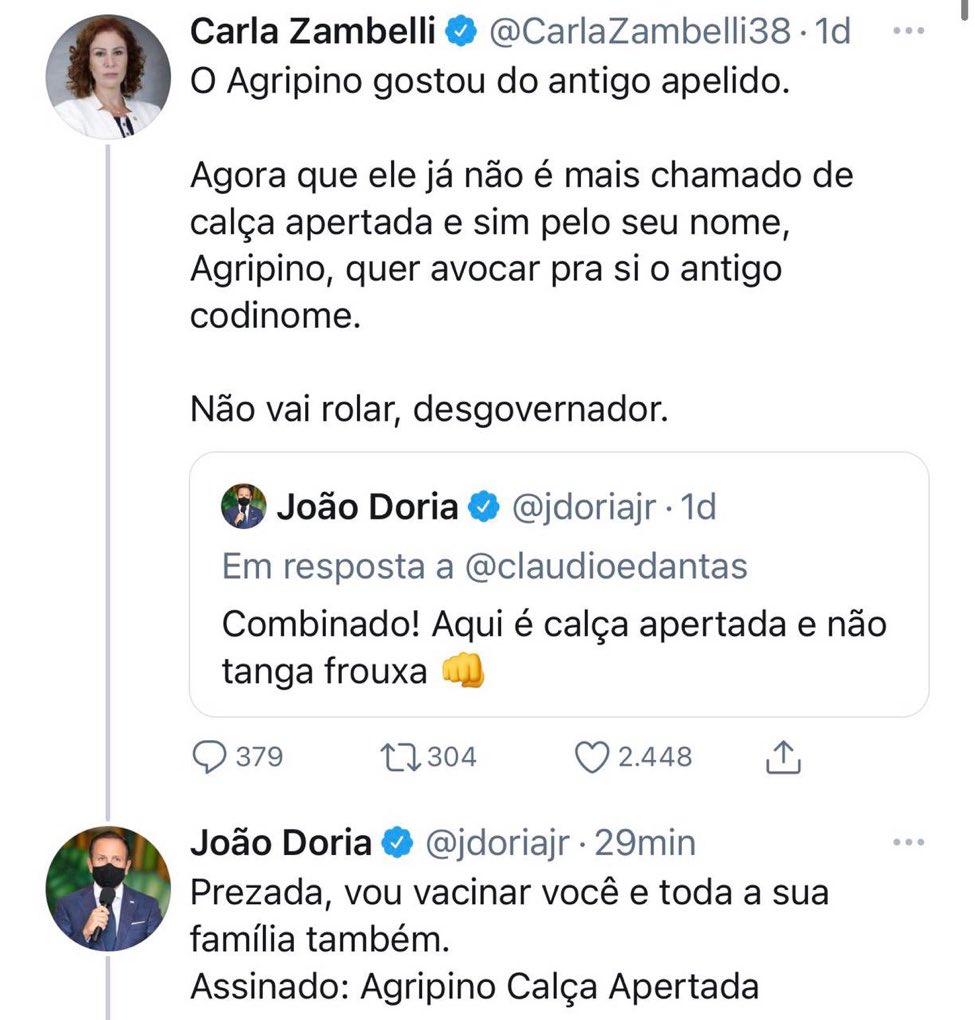 Carla Zambelli Doria Adora Fingir Que Esqueceu Que 95 Da Verba Recebida Pelo Instituto Butantan E Federal E Que Verba Para A Producao De Vacinas E Federal Adora Fingir Que Esqueceu from lookaside.fbsbx.com Os números apresentados por joão doria são um recorte da alta de preços nas indústrias extrativas, que chegou a 87,59% no acumulado em 12 meses encerrados em fevereiro de 2021, segundo o instituto brasileiro de geografia e estatística (ibge). (governo do estado de são paulo) neste sábado (06), o gado bolsonarista fez uma maratona de perseguição ao governador de são paulo, joão doria (psdb), e o chamou de calça enfiada, colada, justa e agripino. O crescente tom homofóbico em ataques do presidente jair bolsonaro (sem partido) e de seus apoiadores aos governadores de são paulo, joão doria, e do rio grande do sul, eduardo leite, ambos do psdb, tem provocado indignação de militantes da causa lgbt em partidos e chegou à esfera judicial. Dória quer governar são paulo com punho de ferro, e aterroriza o brasil quando diz que todos serão obrigados a tomar a vacina chinesa. Em guerra contra os dois tucanos, principalmente por causa das medidas adotadas na pandemia, bolsonaro passou a chamar publicamente doria de calcinha apertada, expressão que faz alusão a calças justas usadas pelo tucano e é reverberada por aliados políticos e seguidores do presidente. Até minha calça apertada está mais cara, ironizou doria. Dória sempre foi famoso por cultivar uma elegância no mais sofisticado estilo metrossexual. Na guerra contra os governadores de são paulo, joão doria, e do rio grande do sul, eduardo leite, ambos do psdb.